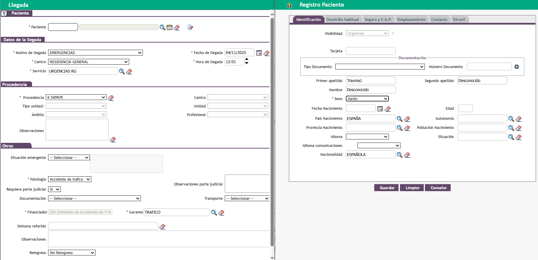 emplea como datos: Apellidos Trauma1 Desconocido, Nombre: Trauma.